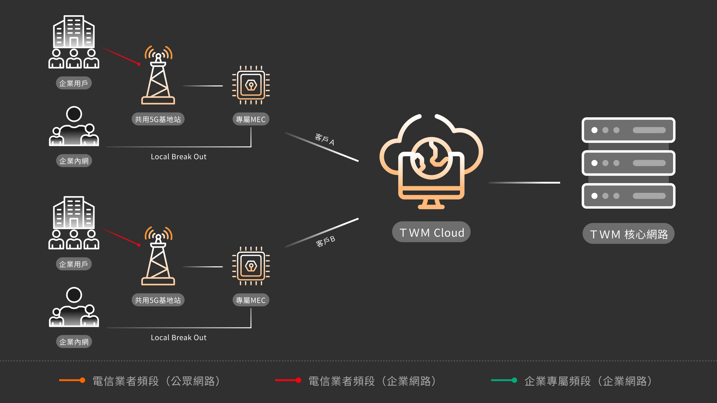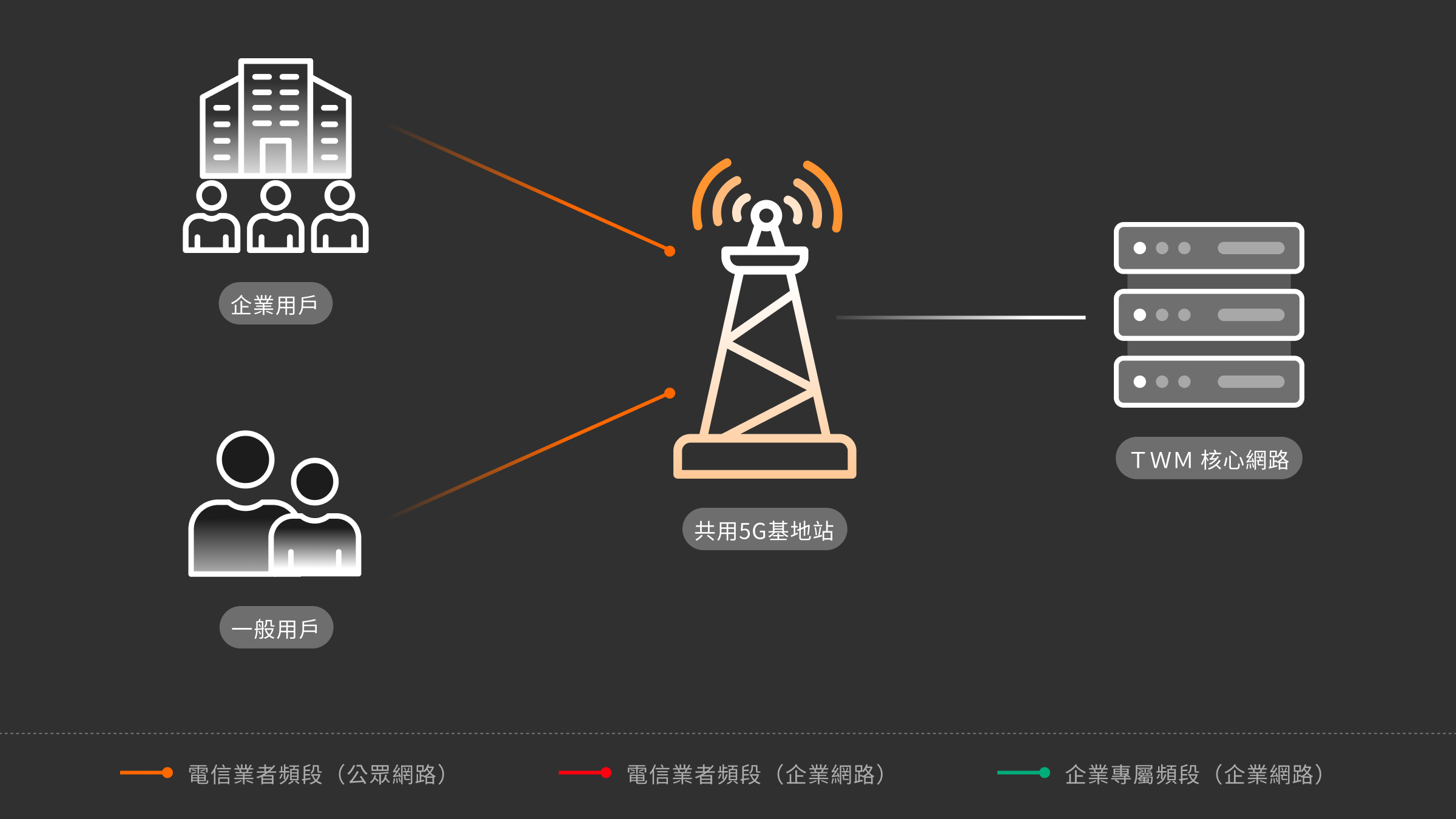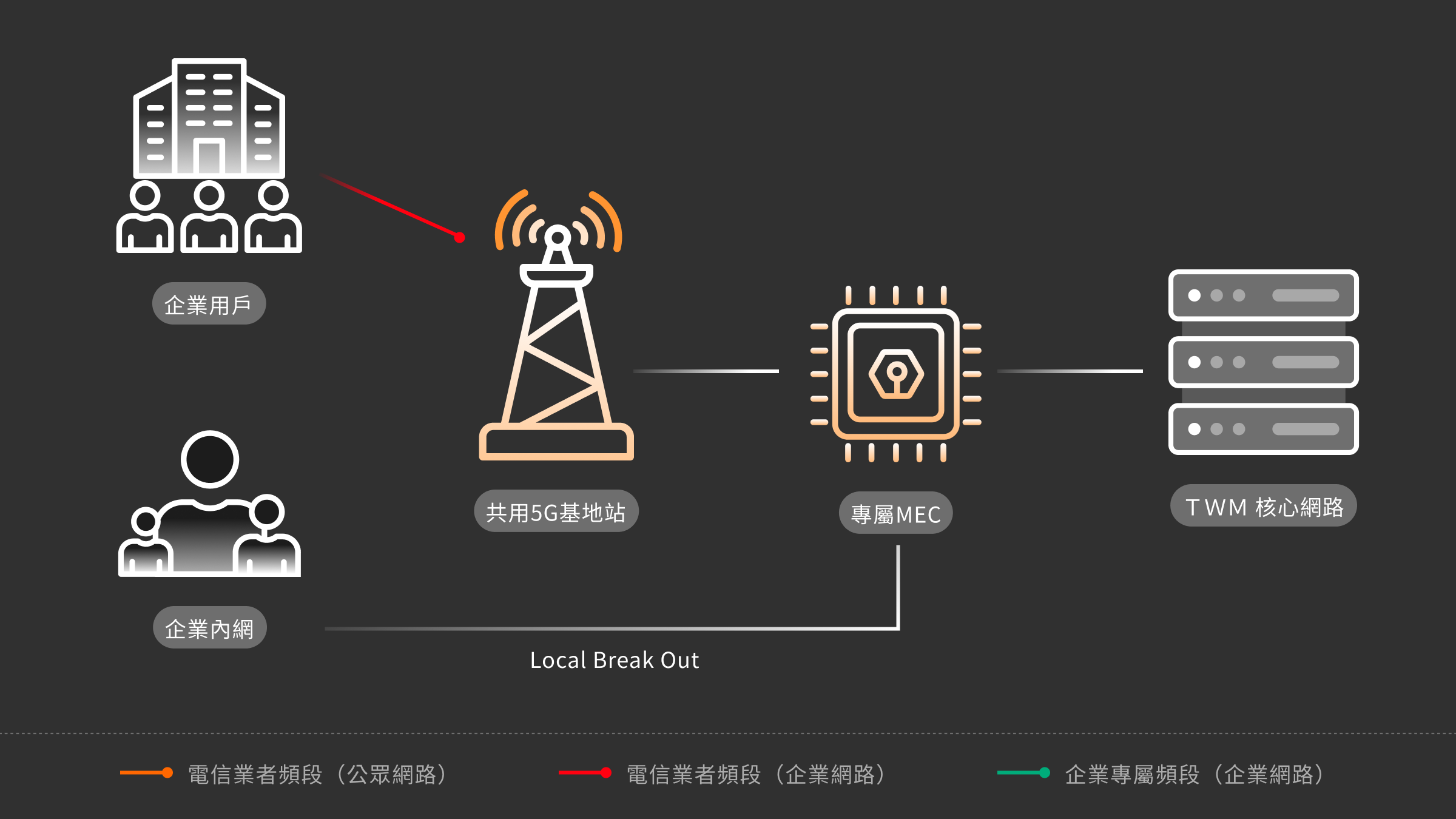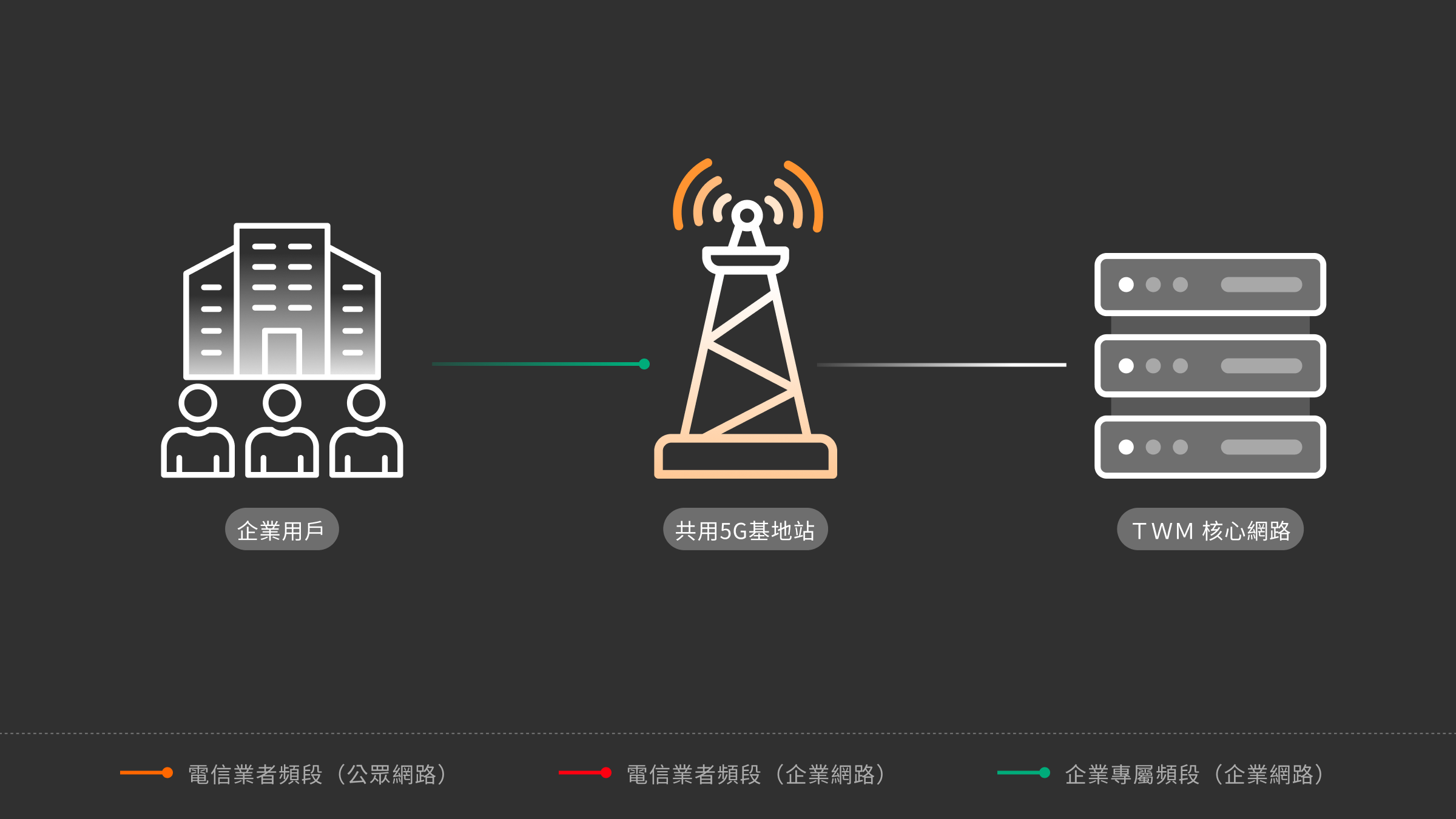 利用台灣大哥大5G高傳輸、低延遲、廣連結、高安全特性,協助企業依應用需求,規劃數位解決方案及架構,提供專屬頻譜,打造專網與行動網路基礎設施,強化企業轉型競爭力