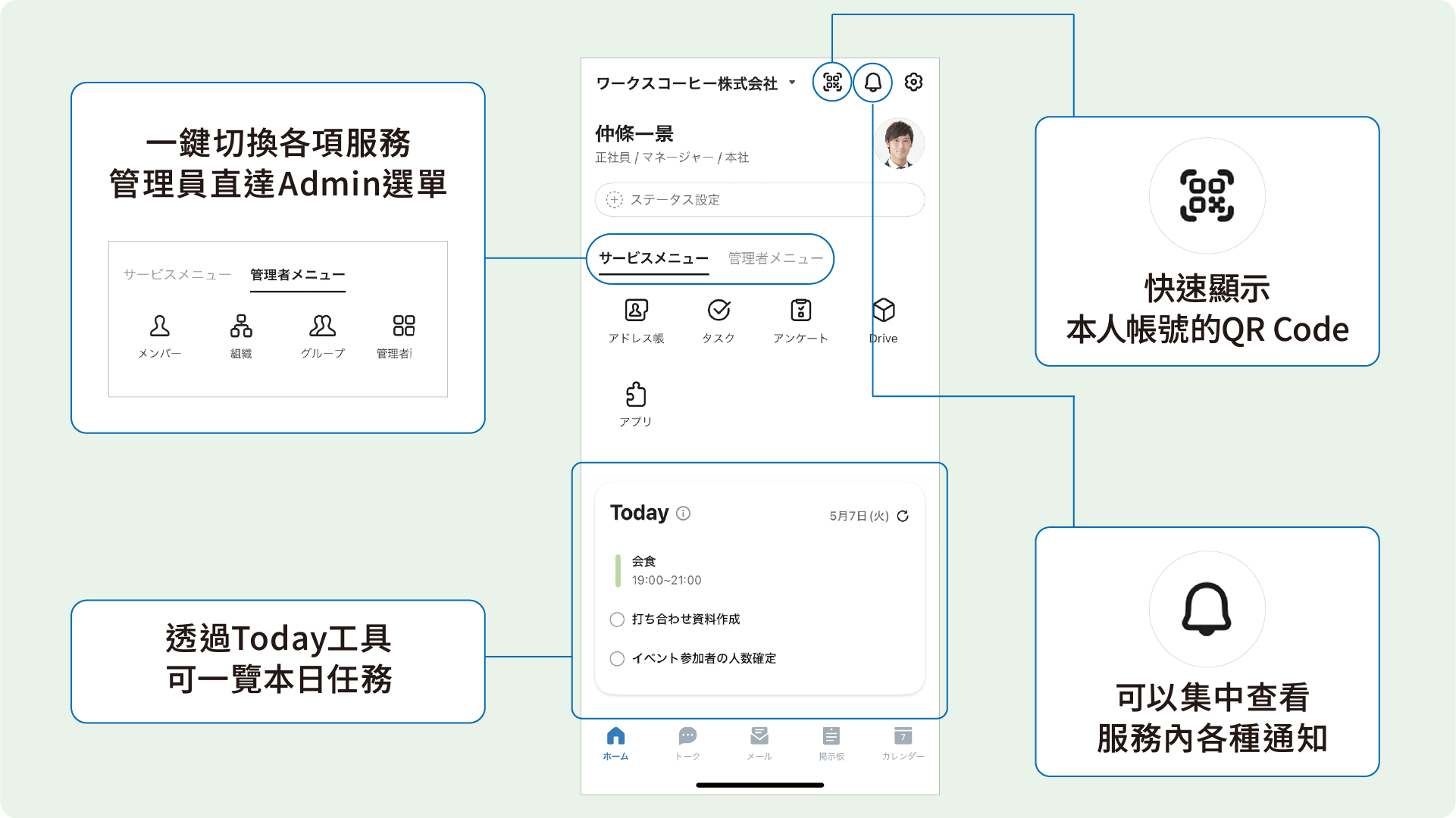 最適合台灣企業的溝通工具!LINE WORKS也是唯一能直接連結台灣超過90%使用率的通訊軟體「LINE」,讓工作All In One、落實LINE生態系互通,一機打造更靈活智慧的行動辦公室與新工作模式