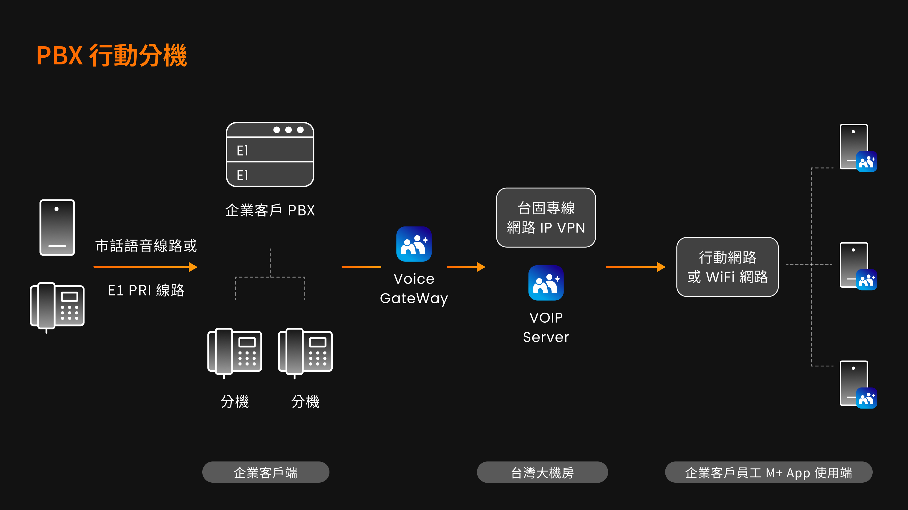 申辦M+行動分機,手機即分機。隨處都可成為辦公地點,重要電話不漏接。還可省去實體桌機採購費用和維護成本,員工撥打公務電話,免加好友、免查通訊錄,更免去個人號碼外流的資安風險