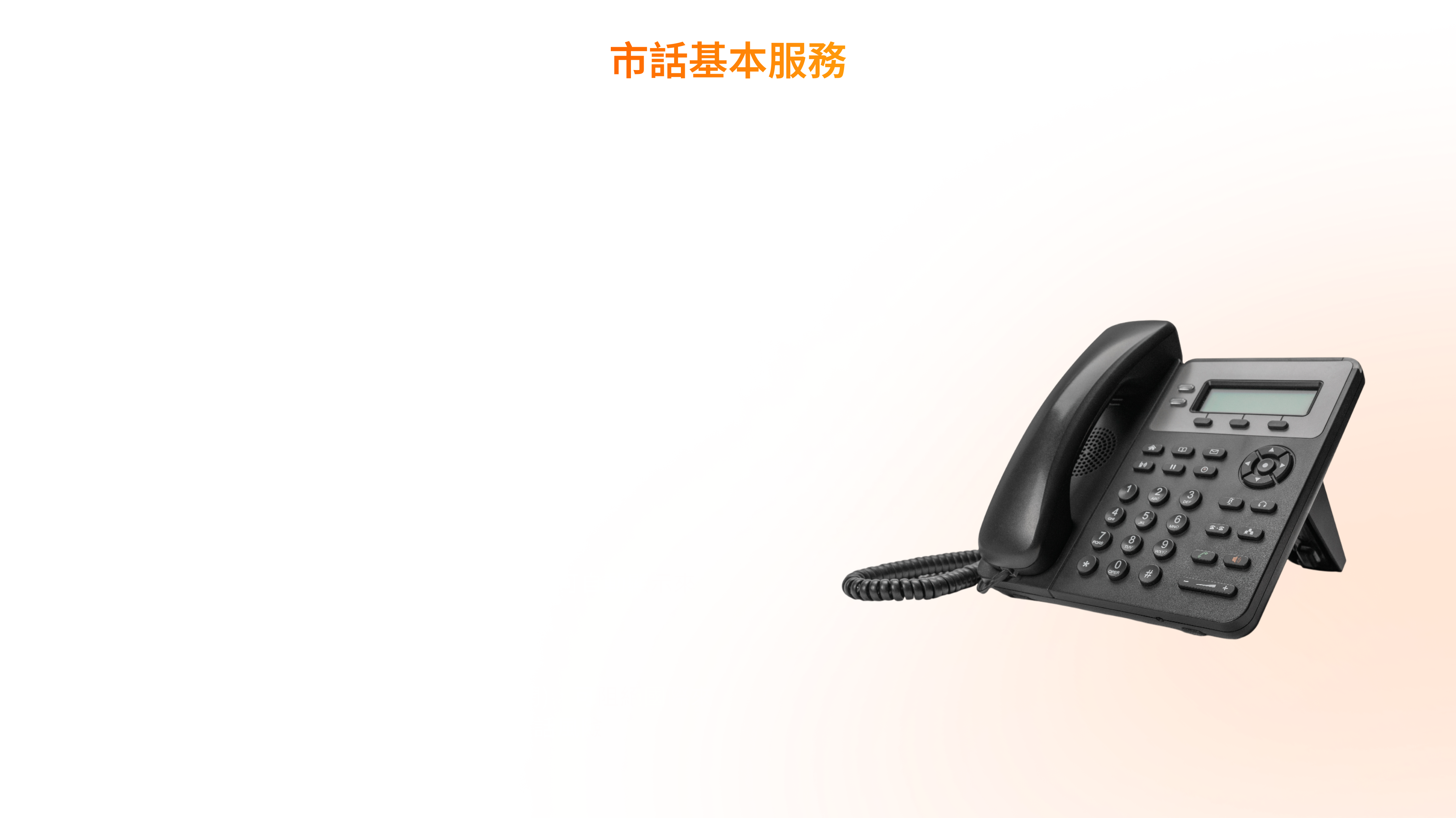 市內電話服務包含一般市話與 ISDN PRI。PRI 提供 T1/E1 高品質數位線路,透過 PRI,電信機房可直連用戶端,語音品質高效穩定,功能同市話,適合大量語音通訊的企業
